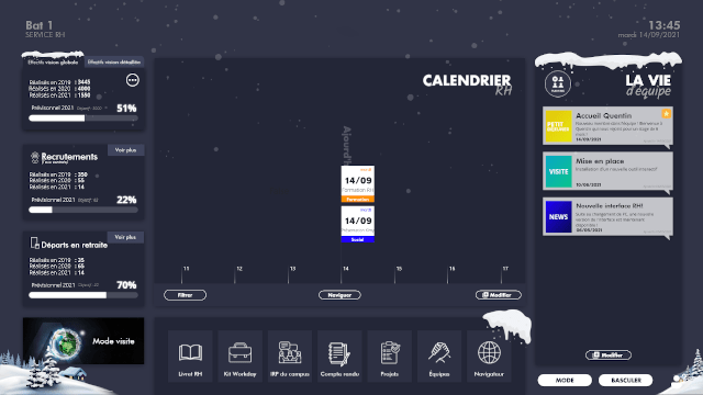 Le RH Dashboard permet à vos employés d’avoir une vue d’ensemble des activités quotidiennes et des événements à venir au sein de l’entreprise. L’agenda personnalisable et le planning d’équipe sont à disposition pour améliorer la gestion du temps et optimiser les opérations de l’entreprise.